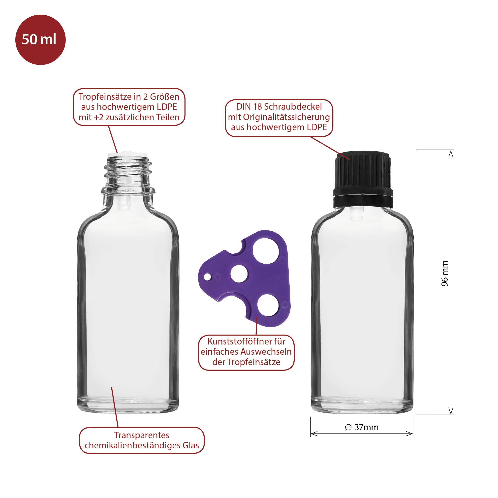 Diese Klarglasflaschen mit Tropfeinsatz-Verschluss schützen Ihre Öle und Flüssigkeiten vor Sonnenlicht und erhöhen deren Haltbarkeit. Der Tropfeinsatz wird nach dem Befüllen mit einem Originalitätsverschluss in die Flasche eingedreht und gibt Ihnen so eine zusätzliche Sicherheit. Der Ring löst sich beim wiederholten Öffnen.Geeignet für alle flüssigen Inhalte, Essenzen, Liquids, Extrakte, homöopathische Lösungen, Bachblüten (für Notfalltropfen), Öle, Parfums, DMSO, – und andere. Zur Aufbewahrung und gezielten Tropfendosierung aller Arten von Präparaten, ätherischen Ölen (Aromatherapie), Flüssigkeiten, zum Mischen und Marmorieren von Seidenmalfarben, zum genauen Abmessen flüssiger Zutaten beim Kochen und Backen… HandsUnity Glasflaschen bieten Ihnen eine professionelle Arbeit in einer sauberen Umgebung. Die Flaschen sind einfach zu benutzen: bequem und nachfüllbar. Der dicht schließende Deckel verhindert lästiges Auslaufen. Packungsinhalt:6 transparenten Glasflaschen mit 50 ml Inhalt6 + 1 Schraubverschluss mit Prägering, 6 + 1 Tropfeinsatz mit 0,6 mm Tülle, 6 + 1 Tropfeinsatz mit 1,0 mm Tülle1 x Spritze zum Befüllen der Flasche1 x transparentes Schutzetikett für die Skala der Spritze1 x stumpfe Dosierspitze 2 x 50 mm Luer-Lock1 x Kunststoffschlauch, 3 x 1 mm, ca. 25 cm lang1 x Kunststofftrichter 38 x 30 x 6,6 mmPackung mit leicht ablösbaren Papieretiketten (zur Kennzeichnung des Flascheninhalts) 60 x 40 mm